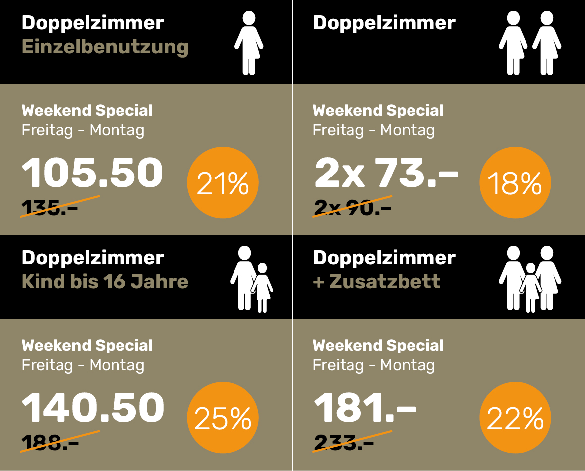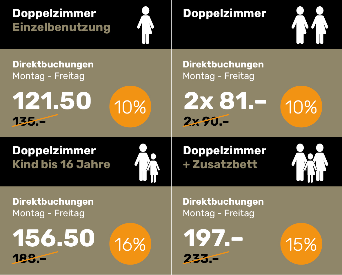 + Zusatzbett CHF 35.– (bis 16 Jahre, Frühstück inbegriffen)