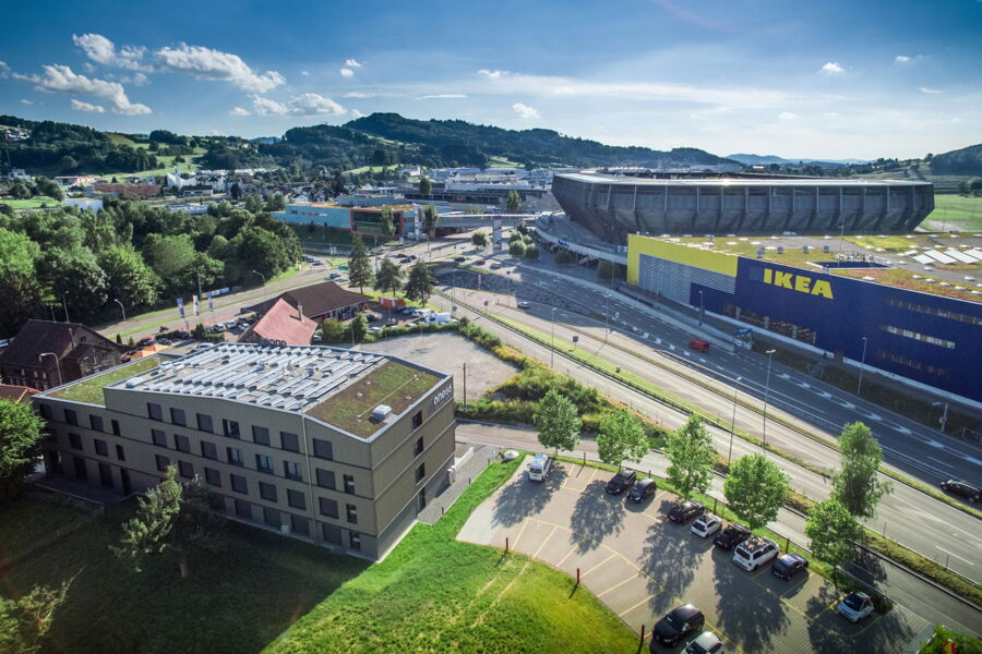 In just a few minutes, you can reach the shopping centres kybunpark, Westcenter and Säntispark, the Gründenmoos sports complex or the multiplex cinema Cinedome on foot. The industrial districts of St.Gallen-West, Gossau and Herisau are also nearby. The city centre and the Olma trade fair grounds are about 5 minutes away by car.